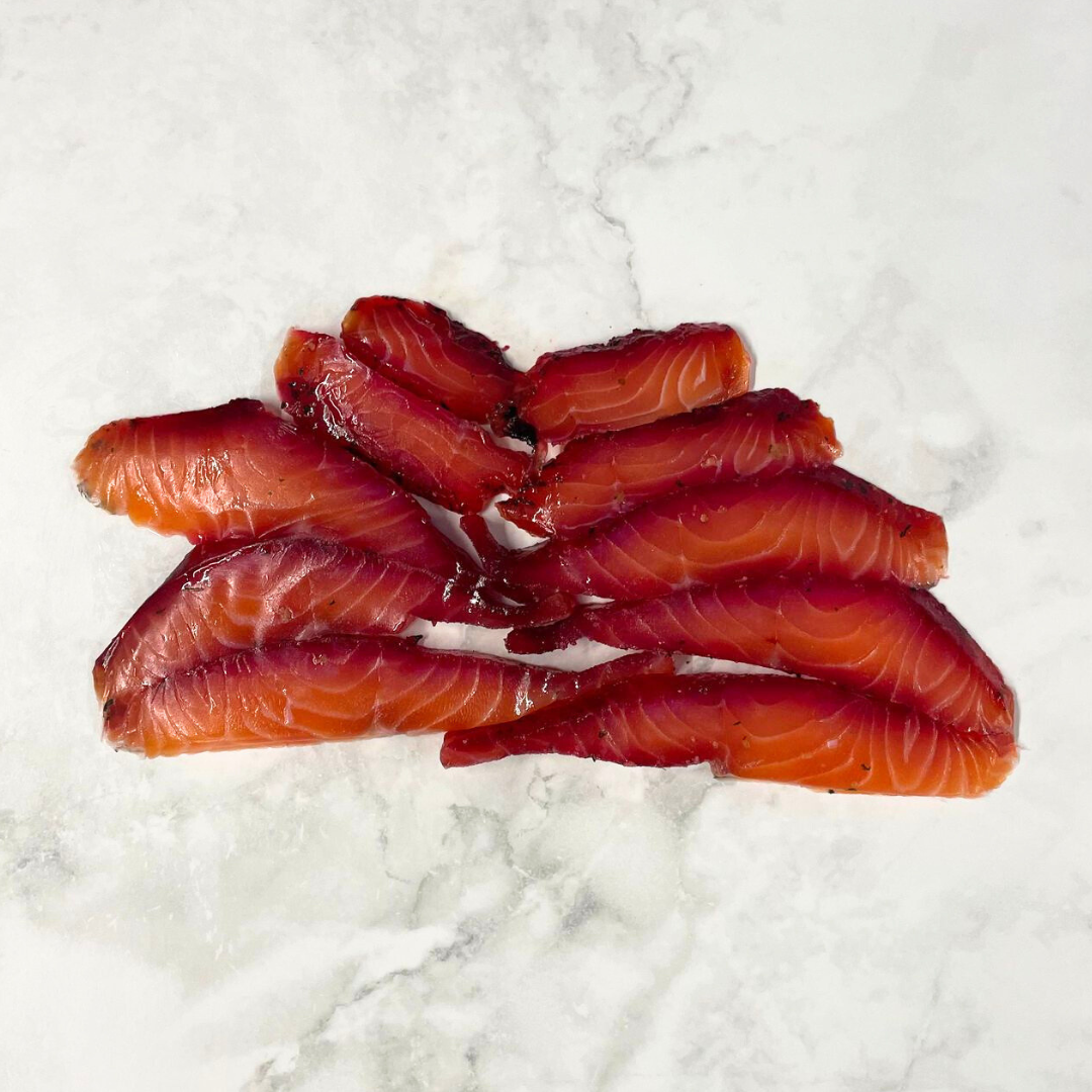Skipper’s Beetroot Cured Salmon is a celebration of craft and colour. Fresh Scottish salmon is gently cured with earthy beetroot, giving the fish a jewel‑bright hue and a subtle sweetness that balances its natural richness. Each slice carries the story of local waters and traditional curing, offering a dish that is as striking on the plate as it is satisfying on the palate.
